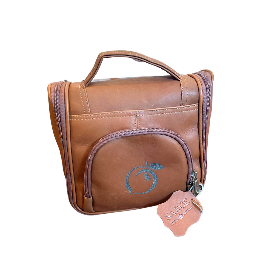 The Hanging Dopp Kit the perfect way to keep your luggage light and toiletries organized. This bag is crafted from top grain cowhide leather, and durable, easy to Clean Mocha Brown Nylon Lining. It is accented with antique brass-finish hardware.