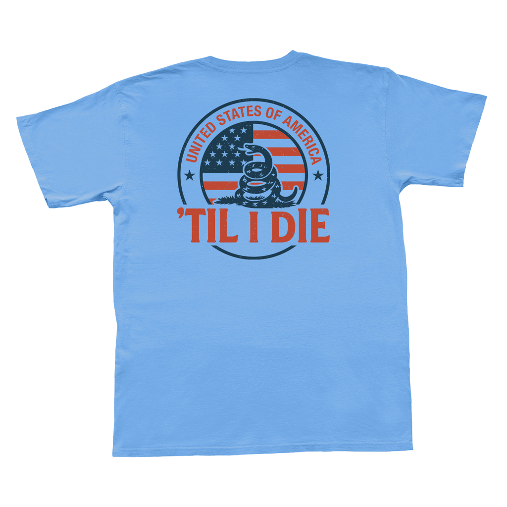 This short sleeve tee features a bold rattlesnake design set over an American flag with “United States of America ’Til I Die” lettering.