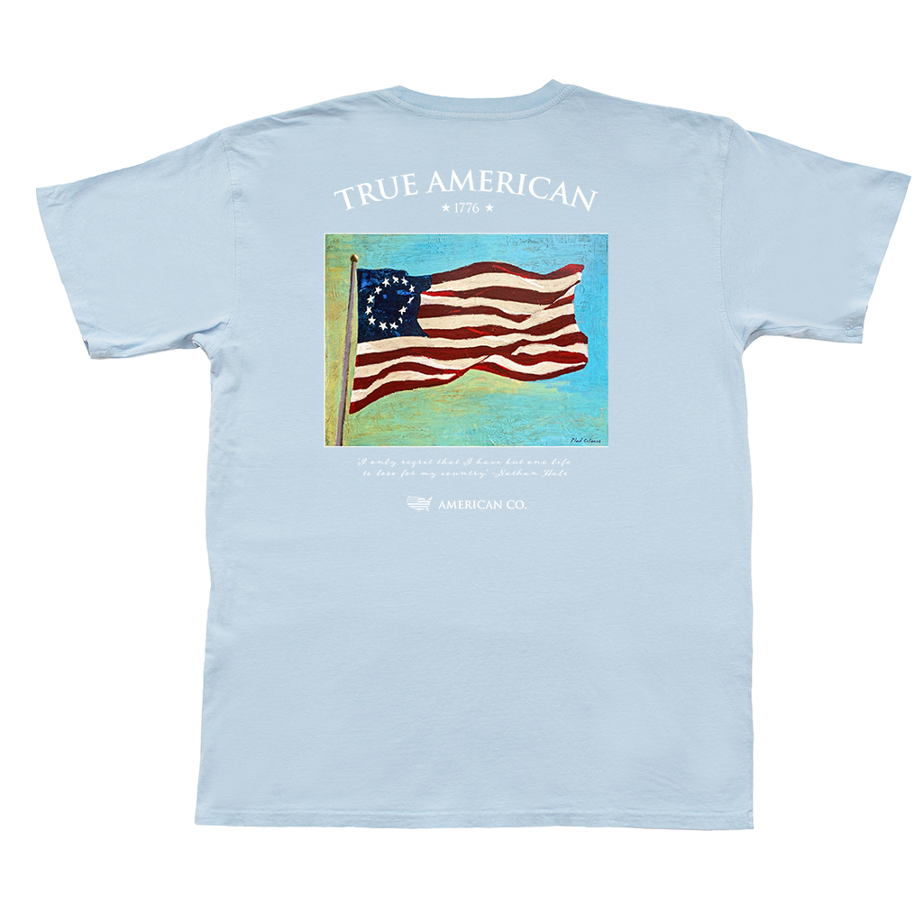 A timeless nod to American heritage, this tee features a vintage-inspired Betsy Ross flag artwork by Plaid Columns paired with classic “True American” lettering and an 1776 detail. Made from soft, lightweight fabric for all-day comfort, it’s an easy staple for patriotic holidays or everyday wear.