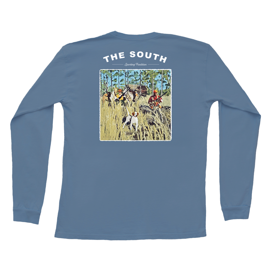 This Peach State Pride long sleeve tee features classic quail hunting artwork by Georgia Artist, Rob Matre!