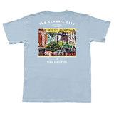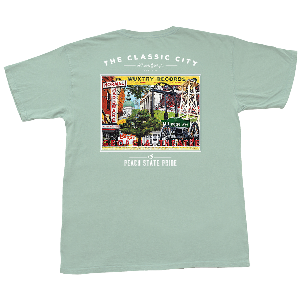 The Peach State Pride cotton short sleeve pocket t-shirt with a classic fit featuring a montage of Athens, Georgia, with The Classic City Establishments artwork by Plaid Columns.