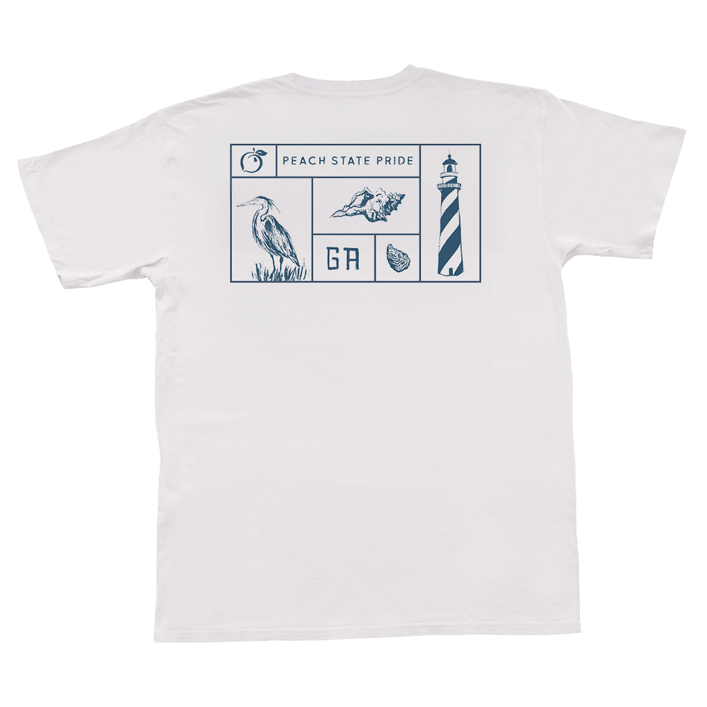 From the shoreline to the marsh, this tee highlights Georgia coast icons featuring a lighthouse, oyster shell, and other icons in a timeless coastal design.