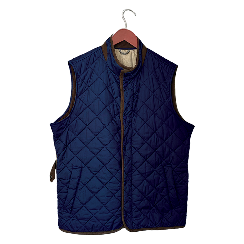 Introducing our classic quilted vest: a stylish, quilted fabric design with suede trim. It features a stand collar with snap closure, a full snap placket, and side and internal pockets for convenience. Designed in a classic fit silhouette, this vest effortlessly complements any wardrobe ensemble.