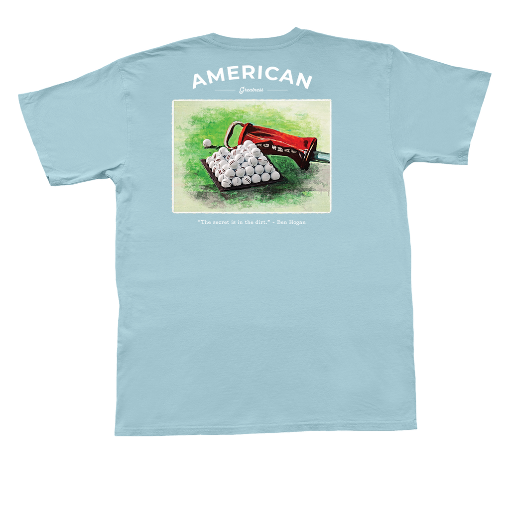 Inspired by golf legend Ben Hogan, this tee features a design of a range basket filled with golf balls. With the quote, "The secret is in the dirt," it's perfect for golf enthusiasts who appreciate hard work and classic American style.
