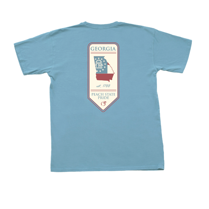 The Peach State Pride YOUTH cotton short sleeve t-shirt with a classic fit featuring the Elberta Pin design, named after the Elberta peach.
