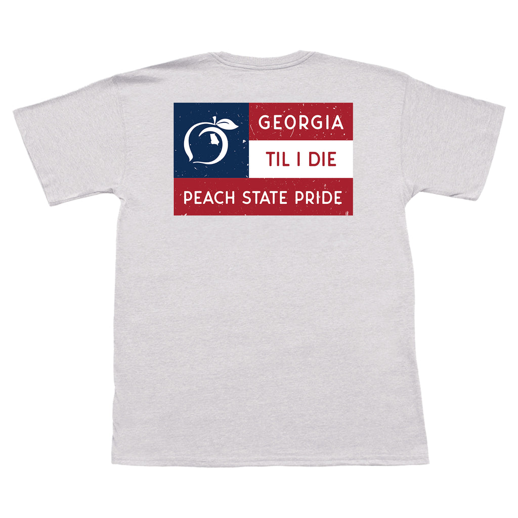 Featuring a vintage-style Georgia flag graphic with "GEORGIA TIL I DIE" and the signature Peach State Pride branding, this chambray-colored tee is perfect for true Georgians who love their home state.