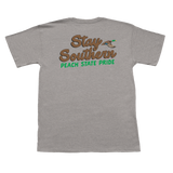 The Peach State Pride cotton youth short sleeve pocket t-shirt with a classic fit featuring Stay Southern Duck Artwork.