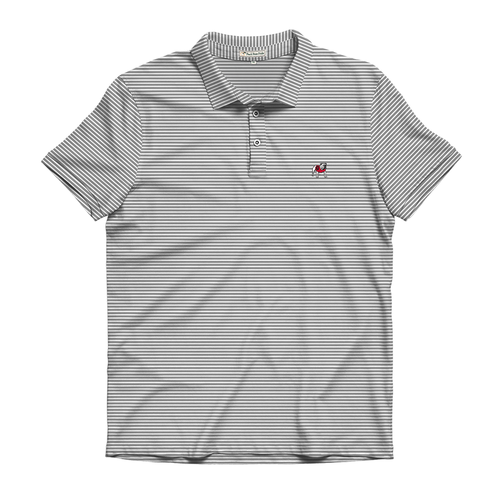 The Peach State Pride Charcoal & White Heathered Jasmine Stripe Polo features the University of Georgia's Standing Dawg left chest embroidery. Perfect for UGA football gamedays!