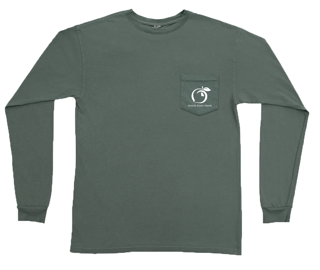 We love some good ole' Hometown Pride and are thrilled to offer you a customized piece to celebrate your southern roots! This style features our classic Peach State Pride logo and the town you love. Our cotton long sleeve pocket t-shirt has a classic fit and is a fan favorite.