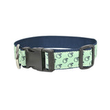 Nylon ribbon collars with classic Peach State Pride logo. Heavy duty plastic snap closure with adjustable sizing. Choose from navy or mint. Made in the U.S.A.