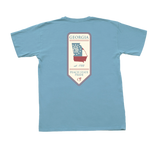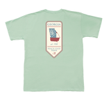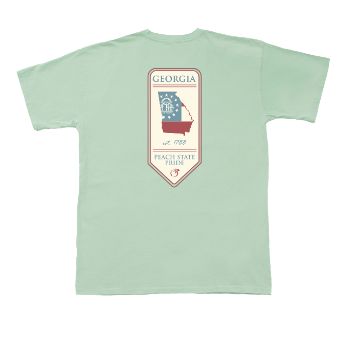 The Peach State Pride YOUTH cotton short sleeve t-shirt with a classic fit featuring the Elberta Pin design, named after the Elberta peach.